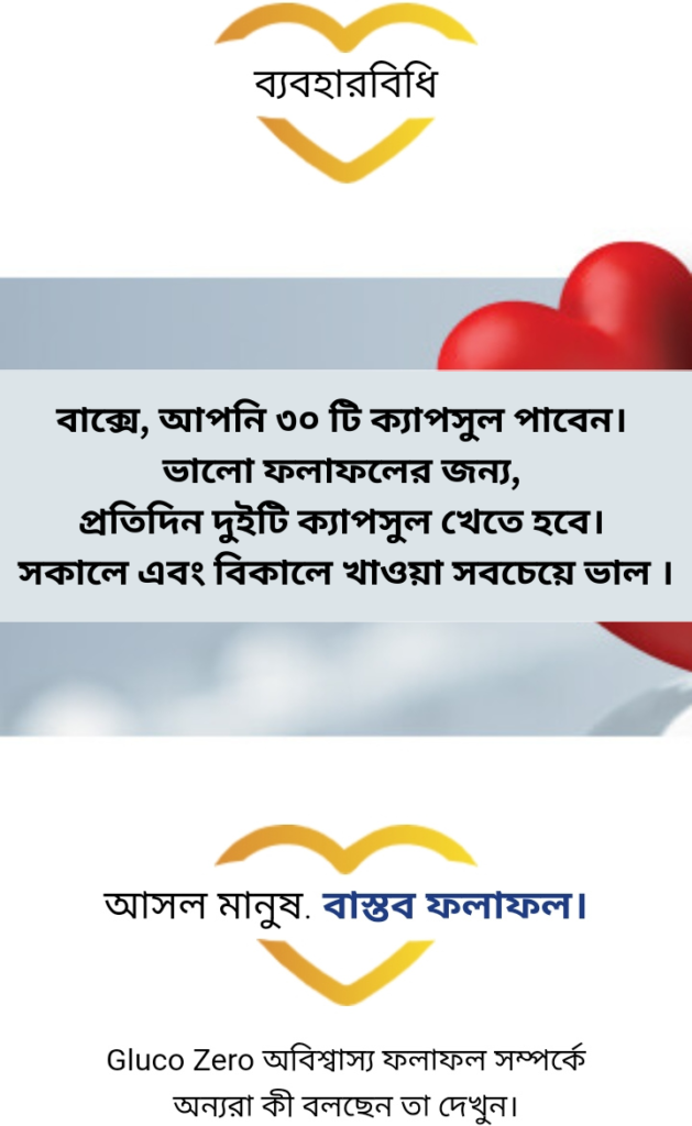 আমি ৬ মাস ধরে Gluco Zero সেবন করছি।এখন আর আমার ইনসুলিন ব্যাবহার করতে হচ্ছে না।পাশাপাশি আমার উচ্চ রক্তচাপ ছিলো ১৪০-১৬০ বা মাঝে মাঝে বেশি।এখন তা ১২০/৭৮ এর কাছাকাছি থাকে।ক্যাপসুলগুলো সেবন সুবিধাজনক এবং অত্যান্ত কার্যকরী।